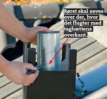 Oppe på taget markerer du, hvor røret skal saves over. Det skal flugte med taghættens overkant som vist her.
