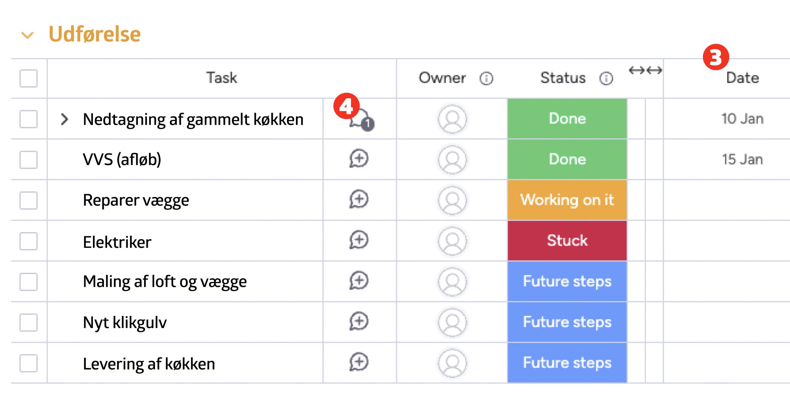 Vi skal udskifte køkken, og vi har delt projektet op i faserne “Planlægning” og “Udførelse”. Vi har brugt forholdsvis få kolonner for at begrænse kompleksiteten.