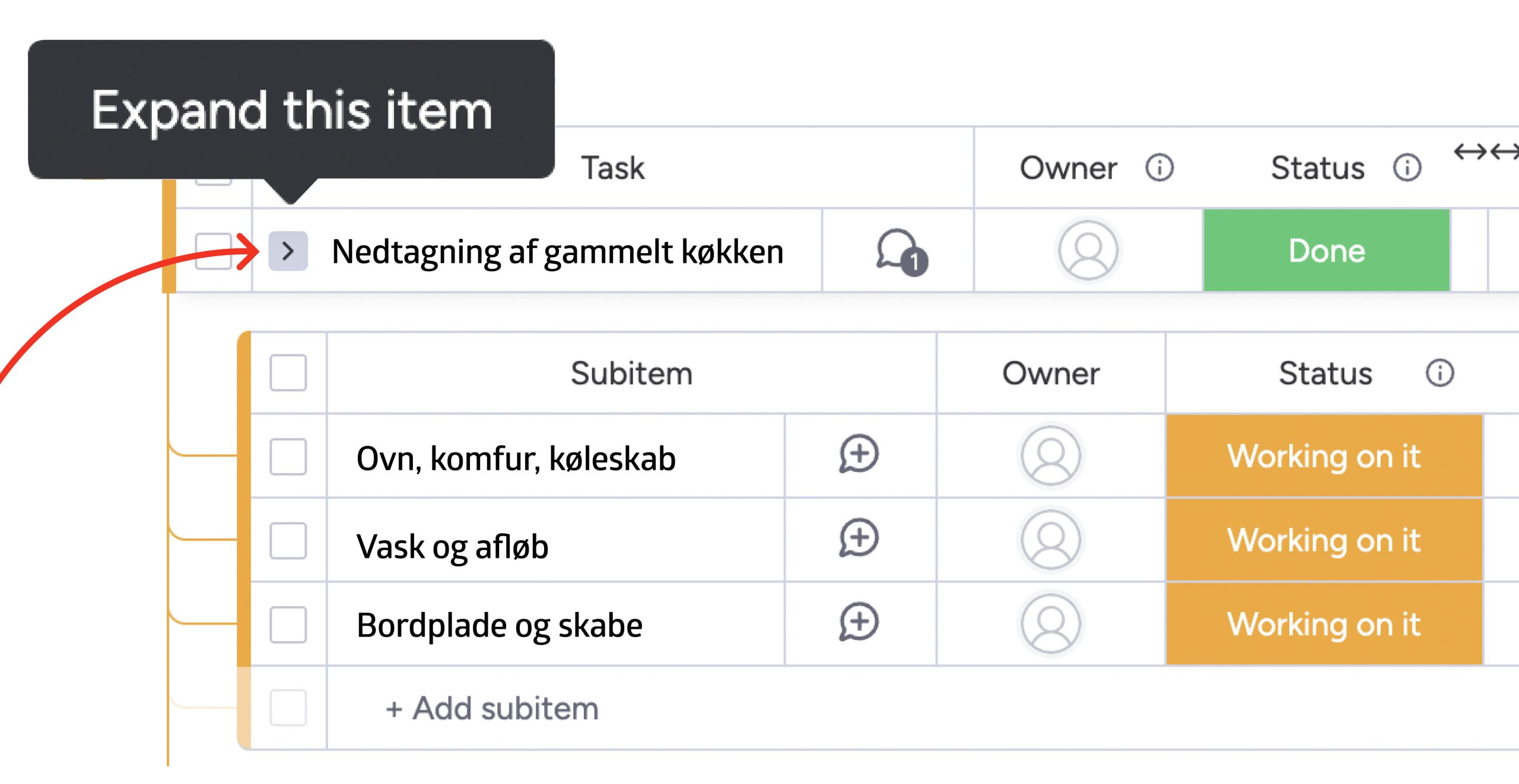 Ved at trykke på “+ Add subitem” nederst kan du tilføje flere underopgaver.
