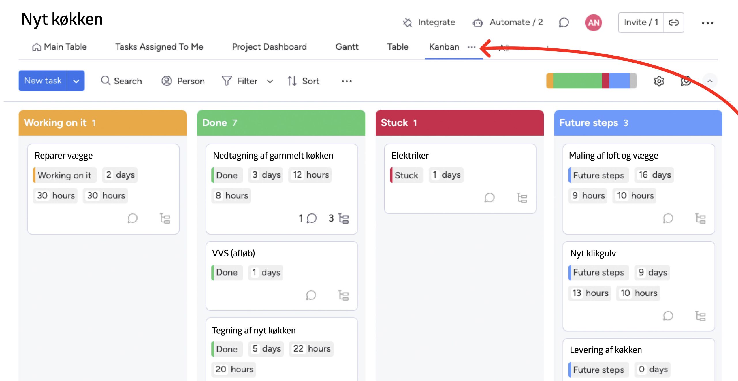 Vores køkkenprojekt er bygget i gratisversionen af Monday.