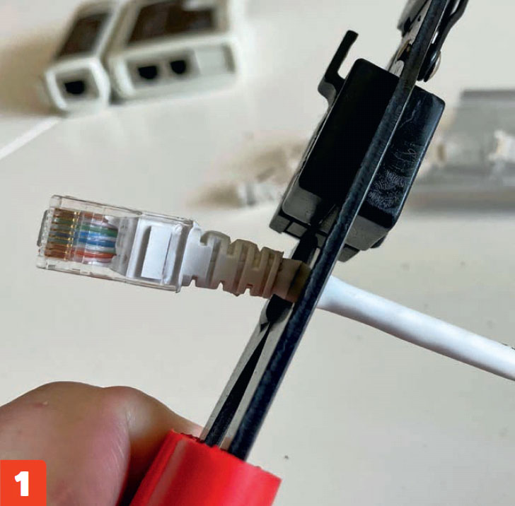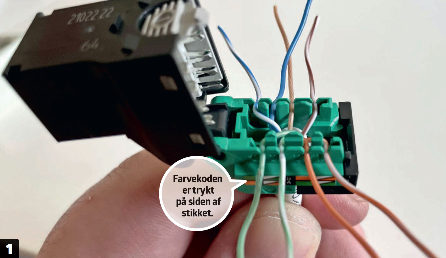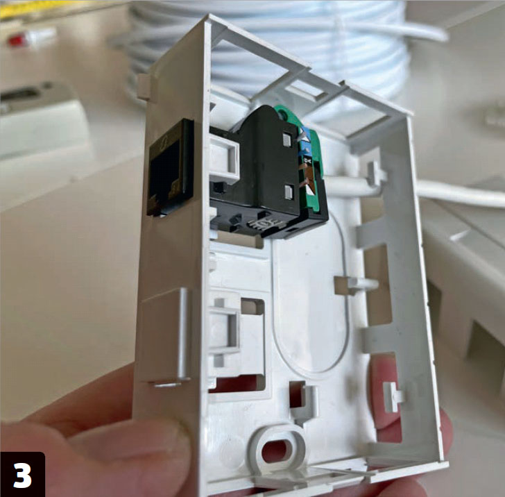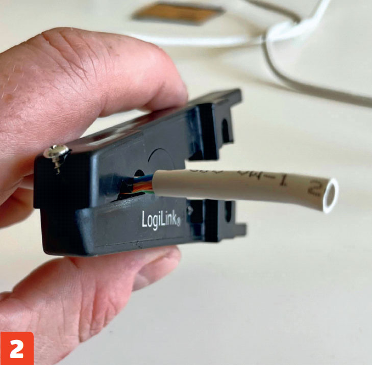 Her bruger vi en montageboks fra Actassi, men selve LexCom 125-stikket, der klikkes i, er det samme, som hvis du fx bruger Fuga-underlag. Vi monterer kun LexCom-stik i den ene ende, mens vi beholder det oprindelige stik i den ende, der skal i routeren.