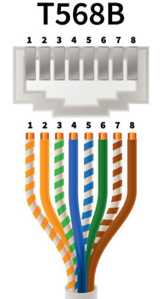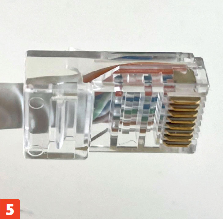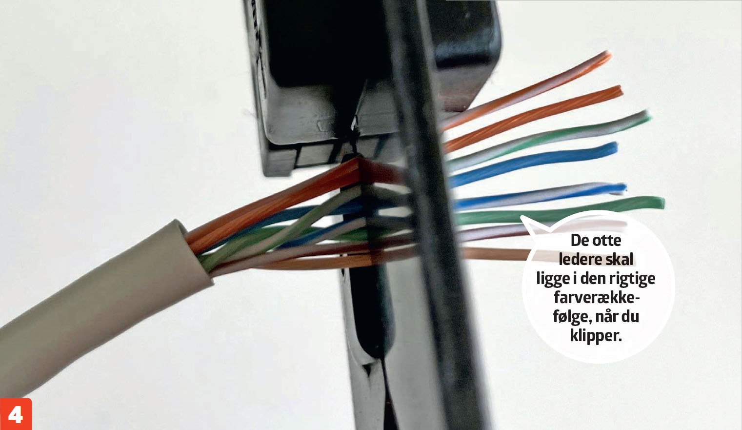 Før forsigtigt de otte ledere ind i stikket på deres rette pladser. Tjek, at alle lederne ligger korrekt inde i stikket. Når du først har klemt stikket med crimptangen, er det for sent at lave om.