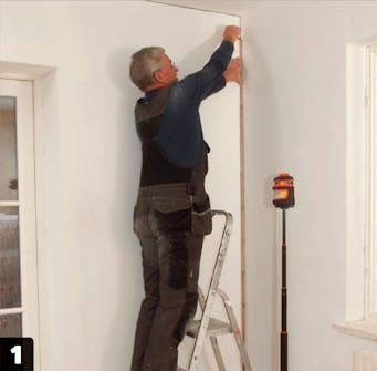 Streg bunden af vægskinnen (A) op 3 cm over den ønskede loftshøjde. Brug et laservaterpas som måleplan. Afsæt ud fra laseren den rigtige højde i alle hjørner, og træk så streger mellem dem.