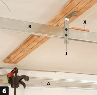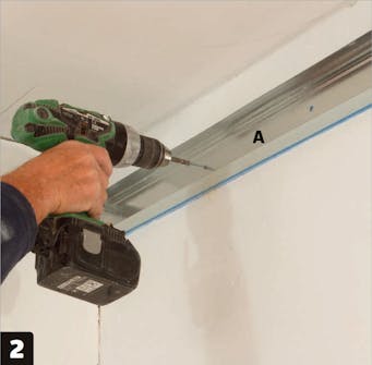 Den første bæreskinne (B) skrues fast i stropperne (J) tættest på snoren med 13 mm pladeskruer. Oversiden skal flugte med vægskinnen (A). Der skal altså være plads til en afstandsklods, som dog straks fjernes.