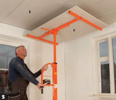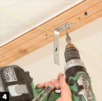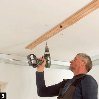 Lav et skrueunderlag ved at skrue kraftige brædder (K) fast i det gamle loft med 5 x 60 mm skruer. Underlaget sikrer, at den øvrige konstruktion har fat i forskallingen under pudsloftet. Under et loft af profilbrædder eller gipsplader skrues planker fast i bjælkekonstruktionen, ikke blot brædder eller gipsplader.