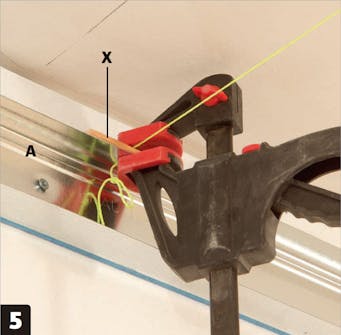 Træk en snor mellem vægskinnerne (A), der sidder midt i rummet. Træk den på tværs af den retning, bæreskinnerne (B) skal sidde. Sæt en afstandsklods (X) under snoren.