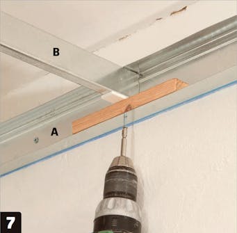Bæreskinnen (B) gøres fast i enderne. I begge ender klodses den op mod toppen af vægskinnen (A). Sæt en 35 mm gipsskrue gennem vægskinne og opklodsning og op i bæreskinnen. Montér alle bæreskinner ens.