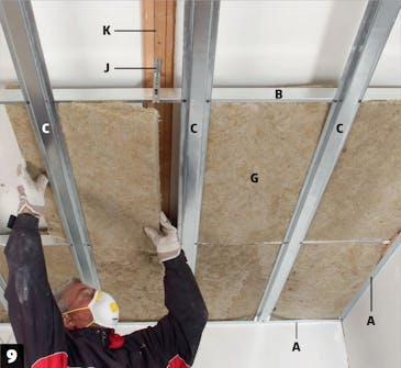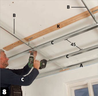 Monteringsprofilerne (C) skrues fast på bæreskinnerne (B) med 13 mm pladeskruer. Profilerne sættes med 45 cm mellemrum. De yderste placeres 45 cm eller mindre fra væggen.