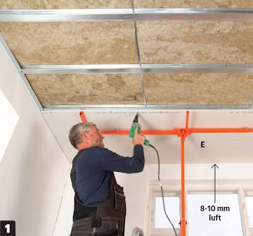 Inde i rummet skrues de på monteringsprofiler, der sættes for hver 45 cm, så alle plader kan fæstnes både i kanten og gennem midterlinjen. Monteringsprofilerne gøres fast på bæreskinner, der hænges op i stropper af hulbånd.