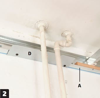 Montér et stykke båndstål (D) bag radiatorrørene (D) på vægskinnen (A). Båndstålet giver et stærkere skrueunderlag til de stumper gipsplade, der skal være på samme sted.