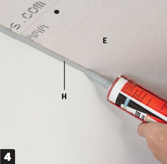 Læg en elastisk fuge ud mod væggen, når første lag gipsplader (E) er oppe. Du skal bruge en god, elastisk akrylfugemasse (H), og fugen skal fyldes helt op. Lav hele fugen i en arbejdsgang, og montér lag to lige efter.