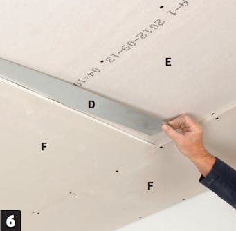Vi sætter to lag 13 mm gipsplader op. Første lag laves af 90 cm brede plader (E). Andet lag laves af loftsplader (F) med fire forsænkede spartelkanter.
