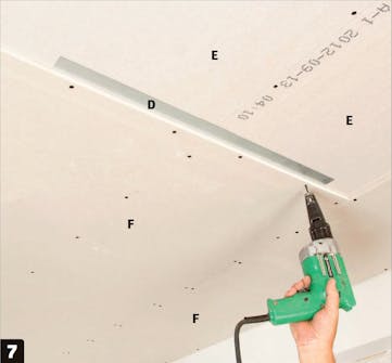 Skab et skrueunderlag. Skub stykker af 70 x 8 cm båndstål (D) ind mellem gipslagene de steder, hvor der ikke er et monteringsprofil at skrue i. På den måde sikrer du et tilstrækkeligt skrueunderlag.
