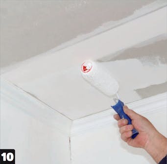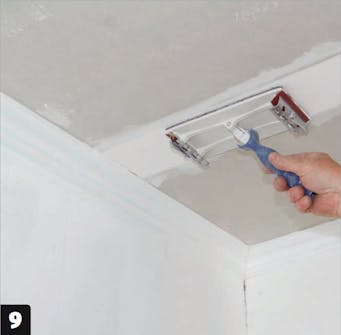 Lav de sidste detaljer. Fugen mod væggen lukkes med elastisk akrylfugemasse. Pladesamlingerne armeres med papir (eller væv) og spartles i flere omgange, skruerne spartles over, og loftet slibes glat.