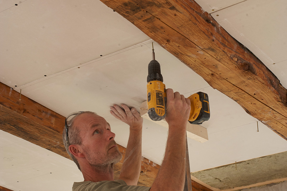 Det kræver et par ture op og ned med gipspladerne for at få målt nøjagtigt op til dem. Hvis bjælkerne er skæve, skal du bruge en skabelon til at save gipspladerne til efter.