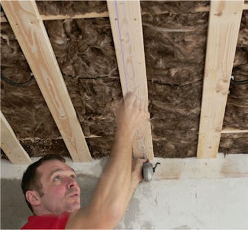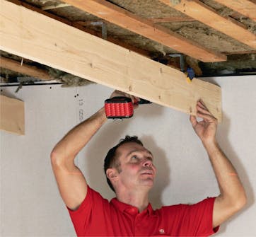 Vi skruer to bræddestykker fast på loftet, de skal hjælpe os med at placere den første plade. Vi har streget pladens kant op med kridtstreg, før vi satte dampspærren op. Klodserne sættes på den side, der vender væk fra den plade, vi vil starte med.