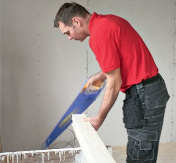 Forskallingsbrædderne (B) kortes af, så de er 1 cm kortere end det stramme mål fra væg til væg. Da de ikke skal sidde helt præcist, skærer vi tre-fire, før vi måler igen.