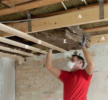 Et eller to brædder (B) sættes op, og en ny række isolering skubbes ind på plads. Det er let at komme til, og du kan lægge din isolering godt og plant og rette den til, så den får den ønskede effekt.