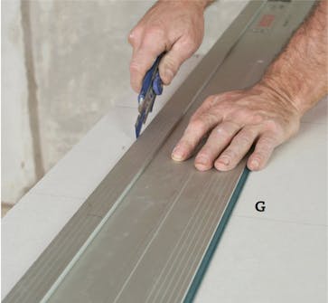 Næste plade (G) skæres til og sættes op. Ved at begynde med en hel plade inde på loftet har vi gjort det let at måle op til de plader, der skal skæres til efter væggen. VIGTIGT! Når du fjerner de to styreklodser, skal du tape skruehullerne i dampspærren.
