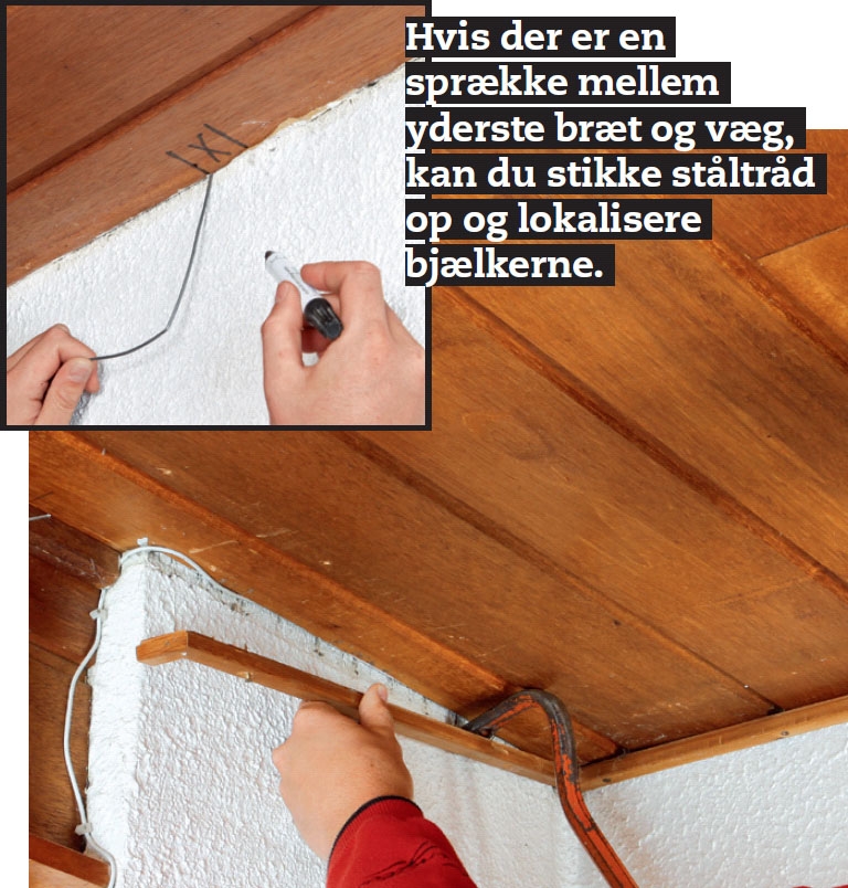 Gipsloftet skal fastgøres uden på det gamle loft. Det betyder, at alle profilbrædder skal skrues ordentligt fast, så du sikrer dig, at de kan holde gipspladerne. Det er vigtigt, at profilbrædderne fastgøres til bjælker (el. spær), derfor skal du starte med at finde ud af, hvor de sidder.