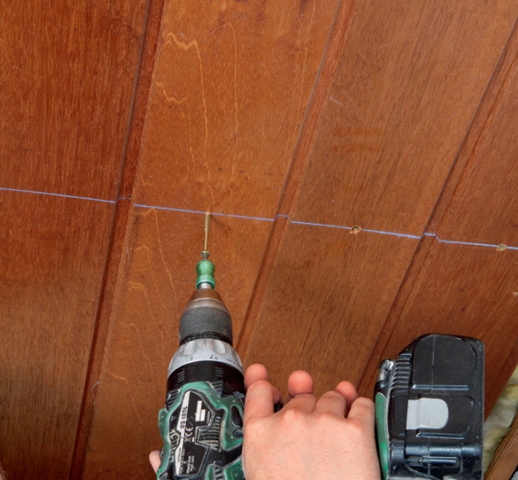 Skru hvert loftsbræt fast til bjælkerne. Forinden spændes en kridtsnor ud, der markerer bjælkernes placering. Monter en skrue (fx 5 x 60 mm) gennem hvert bræt og op i bjælken. Det er vigtigt, at skruen er lang, så den får godt fat.
