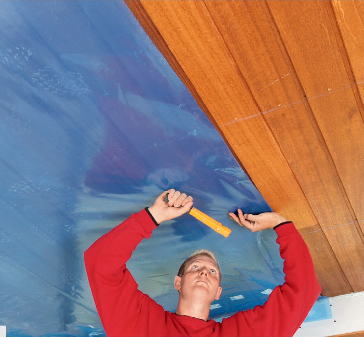 Her sættes dampspærre op. Banerne monteres på langs af brædderne med min. 15 cm overlæg. Så bliver de tætte, når det hele bliver presset sammen. Lad dampspærren hænge 10 cm ned ad væggen, så den bliver tæt ved væggen.