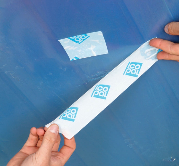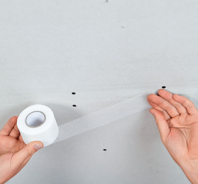Monter armeringstape. Start med de korte kanter. Her er spartelforsænk-ningen dybest, så der er plads til overlappet med tapen for både de korte og lange sider. Bagefter tager du de lange kanter.