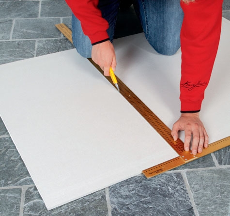 Rejs pladen op på kanten. Bank knæet mod bagsiden af pladen ud for snittet, så knækker pladen bagover i snittet.