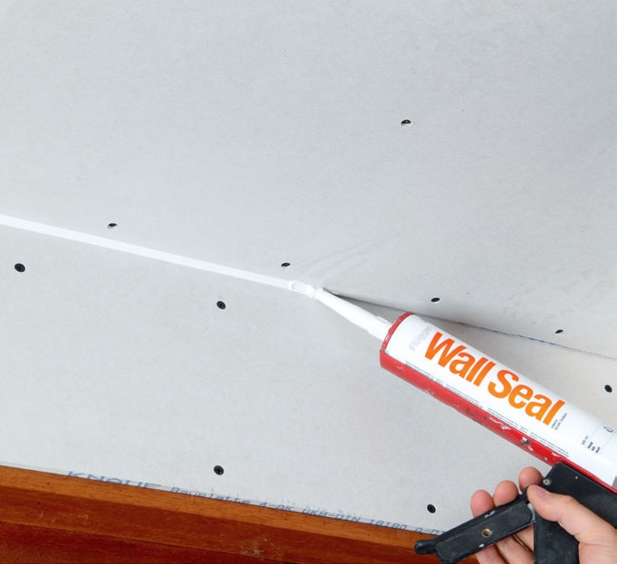 Alle sprækker forsegles med akrylfugemasse, der samtidig tætner mellem dampspærre og væg. Akrylfugen trykkes op i sprækken og glattes.