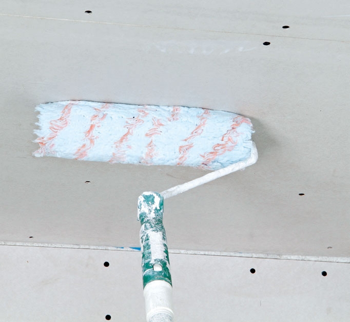 Giv loftet akrylgrunder. Resultatet bliver flottere, og spartlingen går nemmere, hvis du allerede nu ruller loftet over med akrylgrunder. Det kaldes også hæftegrunder, primer, blåvand mv.