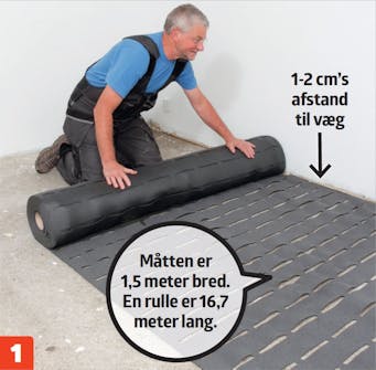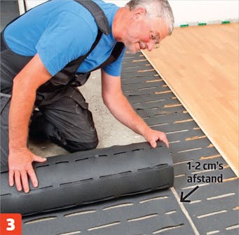 Rul den første bane af måtten ud, og hold et par cm’s afstand til væggen. Måtten rulles ud i samme retning, som gulvbrædderne lægges på om lidt.