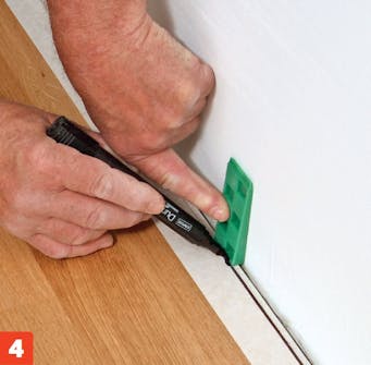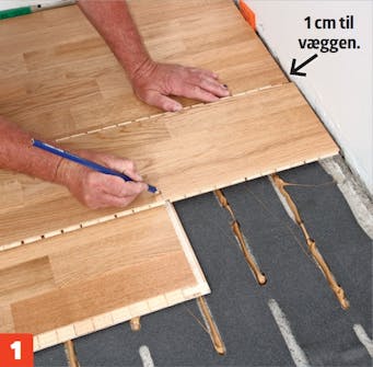 Vend det sidste bræt en halv omgang, hold det 1 cm fra væggen, og mærk op med en blyant. Det stykke, som du skærer af, kan du lægge først i næste række.