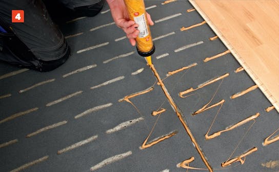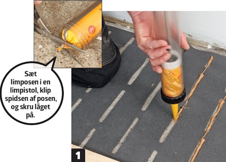 Påfør lim i alle sprækker på en halv meter gulv. Limpistolen holdes lodret. Gulvbrædderne ligger med bagsiden opad, så de nemt kan vippes rundt bagefter.