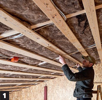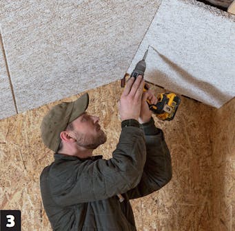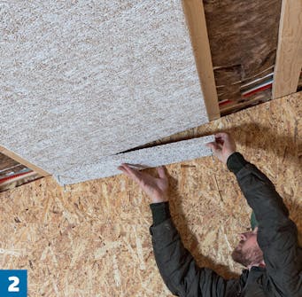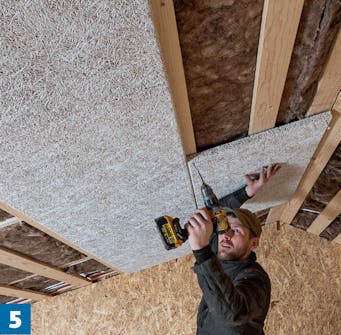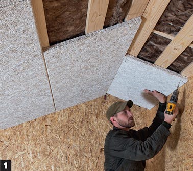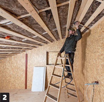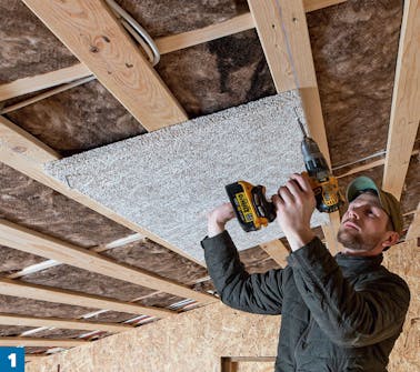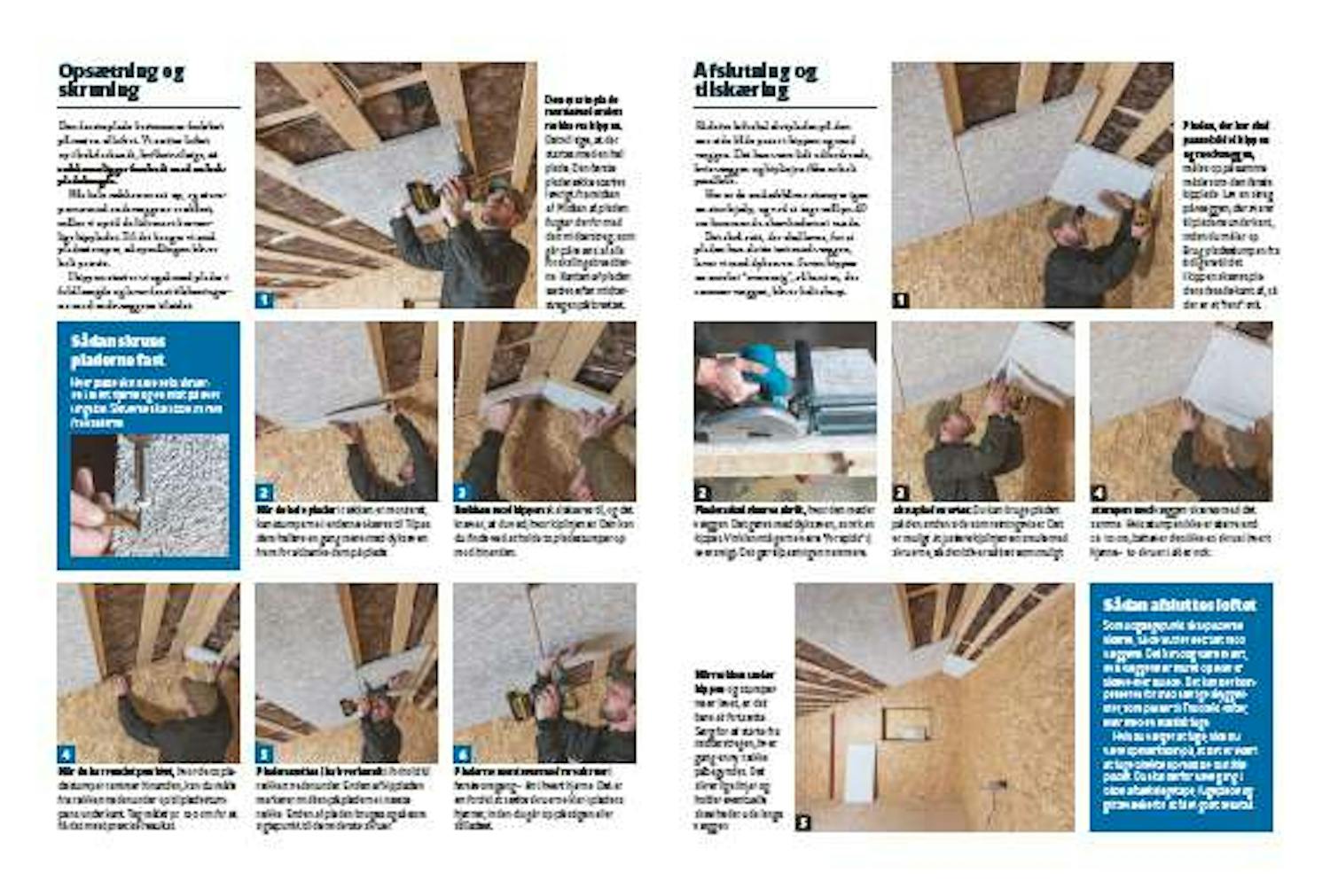 Den første plade bestemmer forløbet på resten af loftet. Vi sætter loftet op i halvforbandt, hvilket vil sige, at rækkerne ligger forskudt med en halv pladelængde.