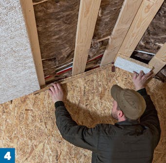 Pladen, der her skal passe både i kippen og mod væggen, måles op på samme måde som den første kipplade. Lav en streg på væggen, der svarer til pladens underkant, inden du måler op. Brug pladestumpen fra tidligere til det. I kippen skæres pladens fasede kant af, så der er et “rent” snit.