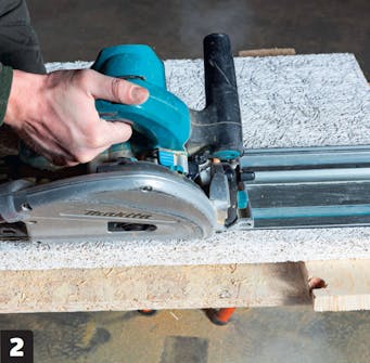 Det skrå snit, der skal laves, for at pladen kan slutte tæt mod væggen, laver vi med dyksaven. Saven kippes en smule i “oversmig”, så kanten, der rammer væggen, bliver helt skarp.