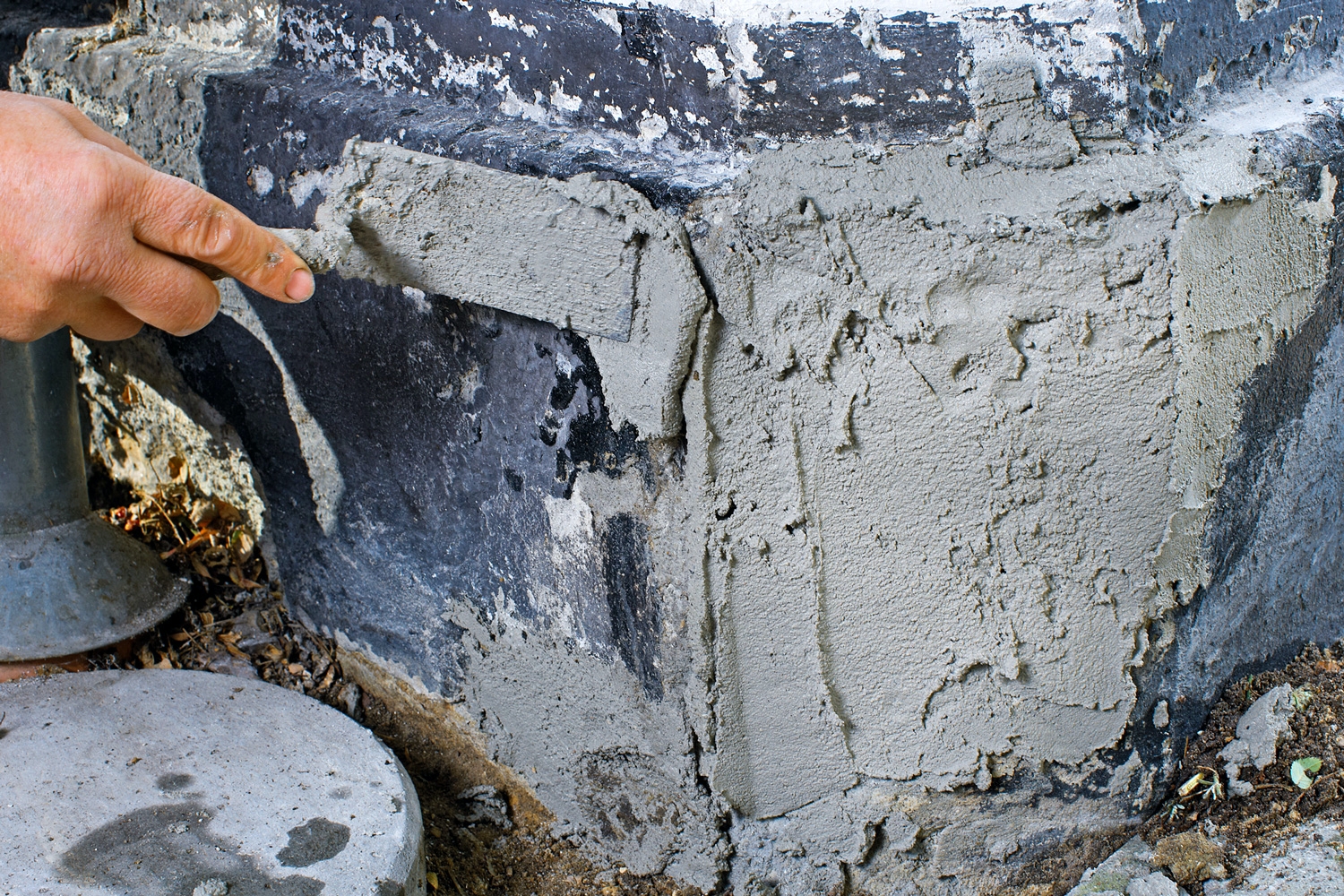 En god og effektiv sokkelreparation består af tre lag puds. Når skaden er renset for gammel puds og skidt, skal du først lægge et grundingslag. Det er et tyndt lag, der skal skabe en forankring for det tykkere lag, som er selve reparationsarbejdet.