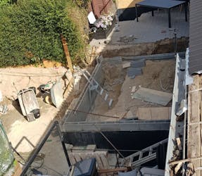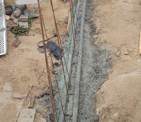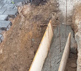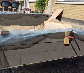 Inden vi går i gang med at grave ud til fundamentet, skal området ryddes. Her leger vi en minigraver. Når renden er gravet og fundamentet støbt, bygger vi siderne op af fundablokke, som vi armerer og fylder med mørtel.