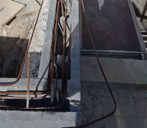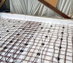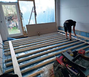 Træskelettet står på et klassisk randfundament, som vi har forhøjet med fundablokke for at komme op i højde med den eksisterende bygning. Selve gulvet bygger vi op af grus, hvorpå vi isolerer med styrolit. Oven på styrolitpladerne lægger vi gulvvarmeslanger og støber et betondæk.