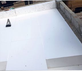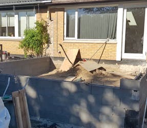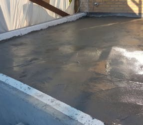 Før vi gik i gang med selve byggeriet, rev vi den eksisterende terrasse ned. Herefter gravede vi ud og støbte et solidt randfundament af fundablokke, inden vi isolerede med styrolit, lagde gulvvarme og støbte betondæk.