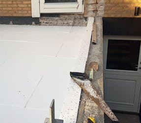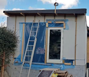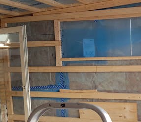 For at lukke effektivt af, monterer vi vindpaneler på væggene. Herefter lægger vi tagpap på taget, isolerer tilbygningen indvendigt og udstyrer den med dampspærre efter producentens foreskrifter.