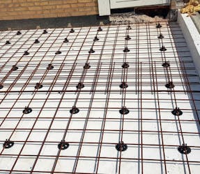 Nu skal gulvet i tilbygningen fyldes op lag for lag. Oven på jordlaget lægger vi stabilgrus, som stampes grundigt, hvorefter vi lægger styrolit, rionet og gulvvarmeslanger, inden vi støber selve betondækket.