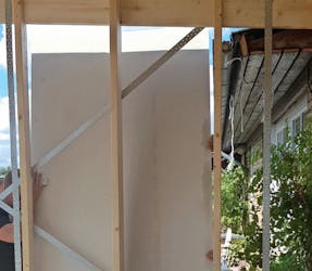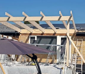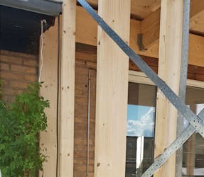 Her starter vi med at montere en kraftig rem på husmuren. Når den sidder, som den skal, sætter vi to vandrette stolper og en rem, som kommer til at udgøre den forreste del af tilbygningen. Herefter monteres resten af de lodrette spær, som udgør væggene samt vindtræksbånd til at afstive konstruktionen.