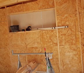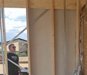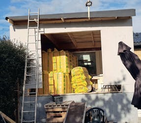 I forbindelse med vores tilbygning har vi valgt at bygge den op af et træskelet af kraftigt spærtræ. Væggene isolerer vi med mineraluld, hvorefter vi beklæder dem med vindspærreplader og vedligeholdelsesfri kompositbrædder udvendigt. På indersiden monterer vi to lag gips. Taget hælder kun 2,5 procent, hvorfor vi vælger at lægge tagpap.
