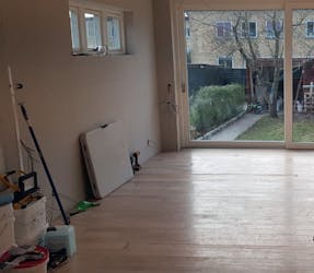 Nu hvor der er lukket godt af, kan vi begynde at lægge gulv, montere gips på væggene og til sidst skure vores vedligeholdelsesfri beklædningsbrædder fast uden på tilbygningen.