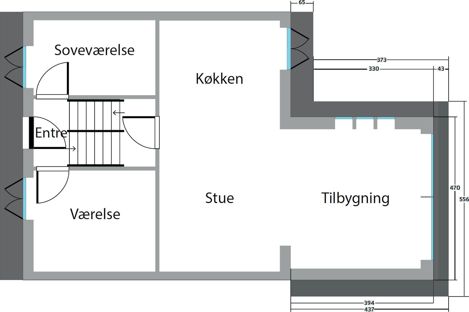 I vores tilfælde passede det rigtig fint med størrelsen, og fordi vores grunde er identiske, fik vi også et godt billede af, hvor meget have der ville være tilbage. I forhold til selve tilbygningen, så har vi i stedet for en enkelt dør bl.a. prioriteret en dobbelt skydedør, så vi rigtig kan lukke op til den nye stue om sommeren.
