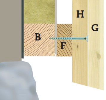 FEJL: Både underbrædderne (G) og de smalle dæklister (H) flækker, fordi de er slået op med for mange søm. Hver gang træet trækker sig sammen i tør luft, modvirker sømmene bevægelsen. Helt galt er dæklisterne sømmet på underbrædderne.