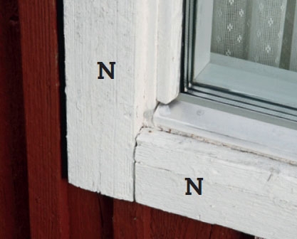 FEJL: I bunden af vinduerne er alt samlet med åbne sprækker og vandrette flader, så vandet løber ind bag indfatningen (N) og videre ind i konstruktionen.