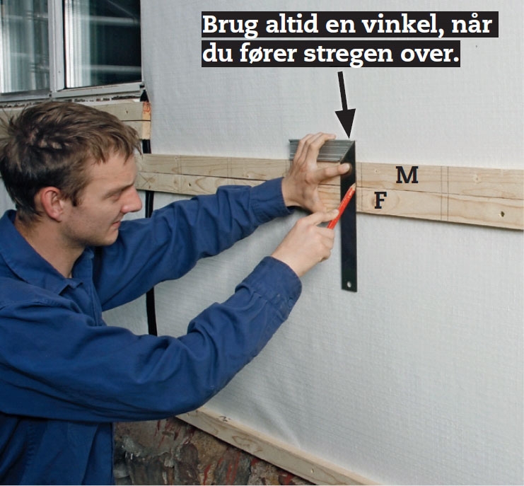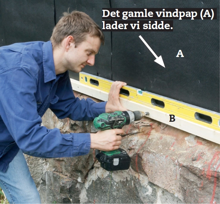 Så opbygger vi det skelet, som den nye beklædning skal skrues op på. Vi starter med den vandrette lægte (B) forneden. Er væggen meget skæv eller bulet, spænder du en snor ud fra hjørne til hjørne og retter lægten op med brikker.
