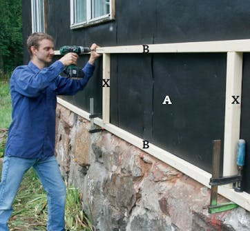Når den næste vandrette lægte (B) skrues op, lader vi den hvile på et par afstandslægter (X), der er 59 cm lange, altså 1 cm mindre end isoleringsmåtterne. Vi har først skruet et vinkelbeslag på enden af afstandslisterne, så de nemt spændes fast.